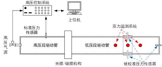 激波管動態校準係統由高壓段驅動管、低壓驅動管、夾膜/破膜機構、高壓控製係統、壓力監測係統、支撐架等組成。