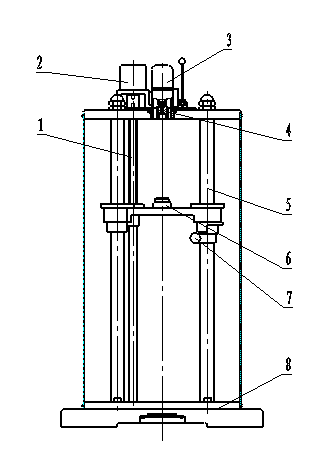 l 1 絲杠 2 步進電機 3 點火裝置4 藥柱模 5-立柱 6 試樣模 7 鎖緊旋鈕 8底座